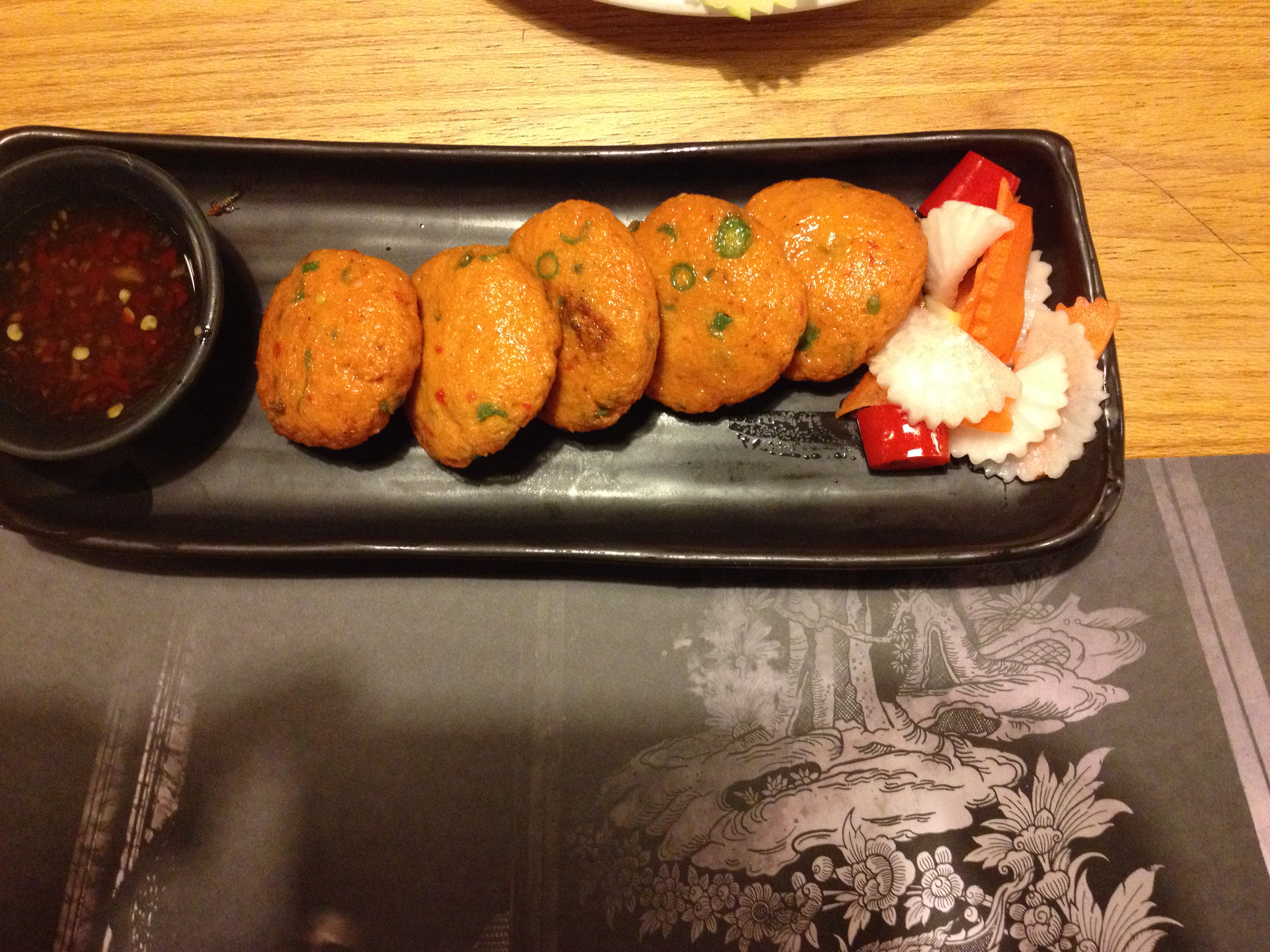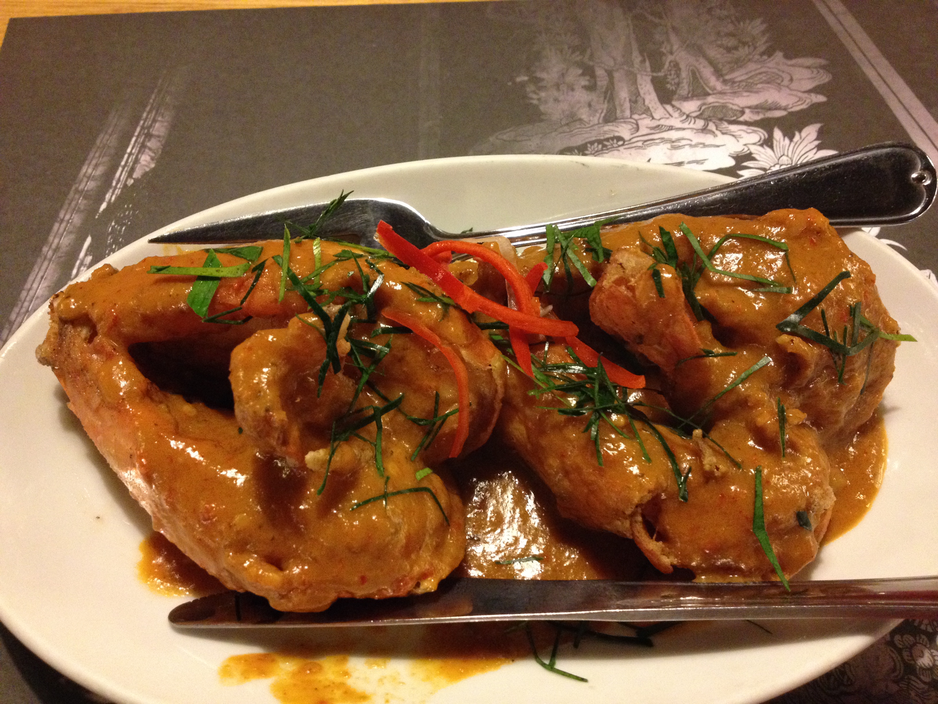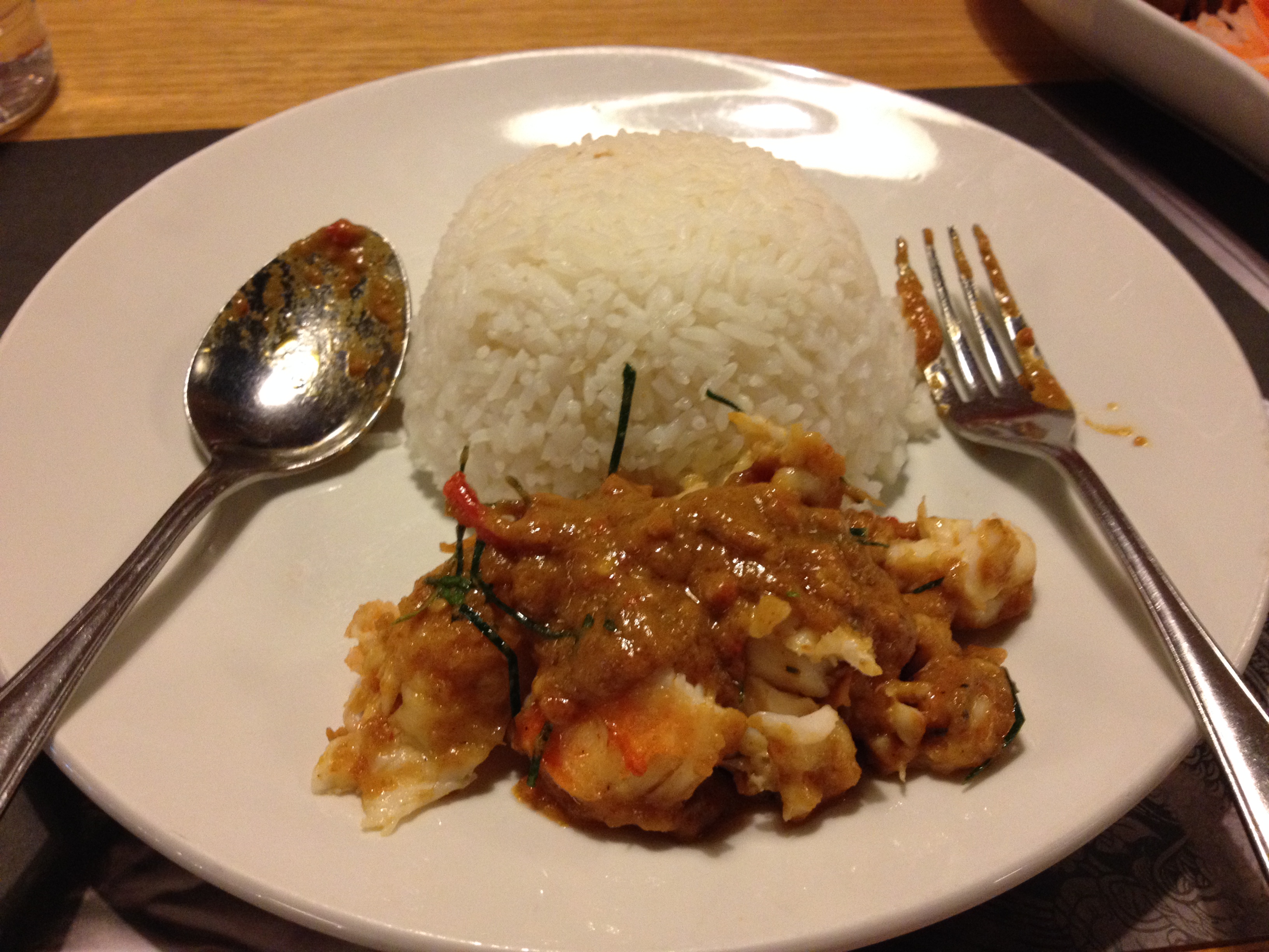 I ordered Choo Chee Goong Maenam – river prawns with red curry paste and coconut cream – as my main dish. The curry paste was not distinguishable from the coconut cream (that was what I was expecting -.-). It was also too peppery for me (I have a very low threshold for peppery foods which people find very funny seeing as I’m Yoruba (a Nigerian tribe) and we are supposed to be able to handle ridiculous amounts of pepper (chilli) in our foods). After a while I was basically gulping the food and not chewing it. My nose was runny and sweaty. And to think that I told the waiter that I did not want spicy food. *sigh* What is it with these waiters? Don’t get me wrong though, runny nose aside, the prawns were very nice. The curry didn’t overpower the coconut cream and the sauce was buttery.