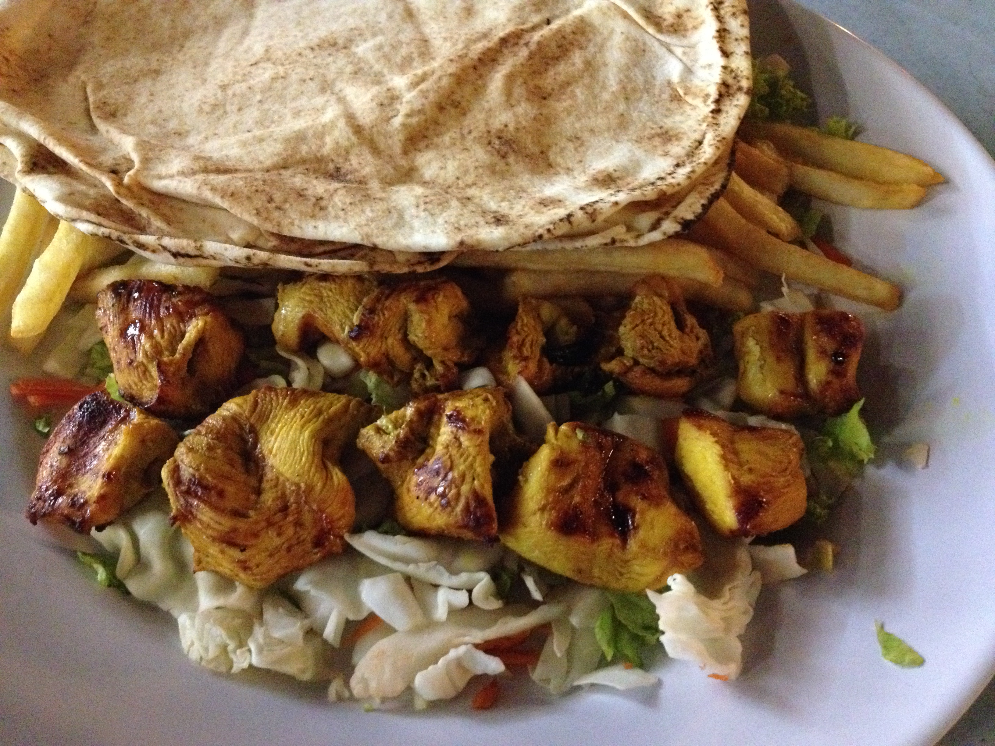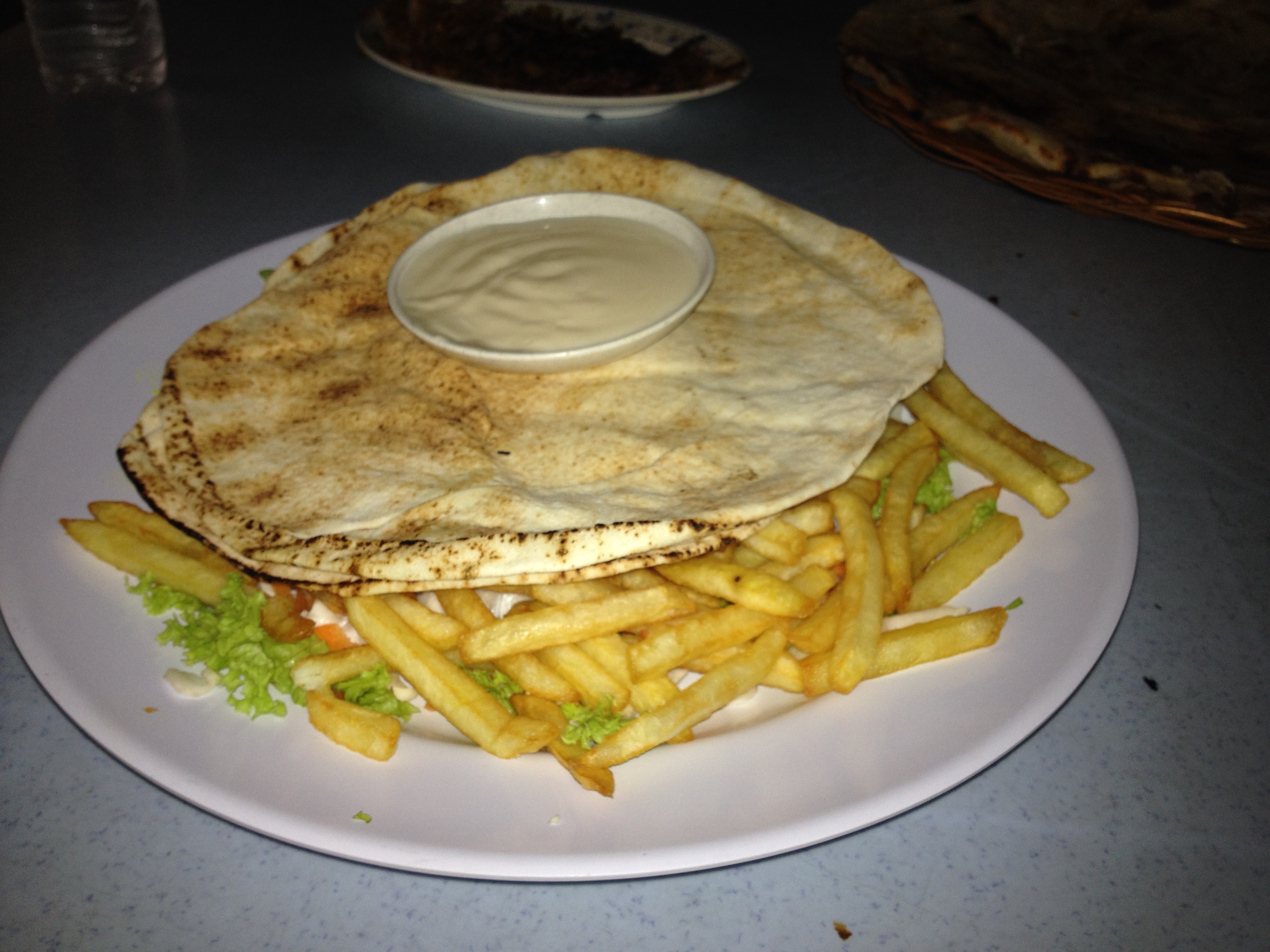 I had the Shish Taouk (or Tawook as I’ve seen it spelled in other menus), my go to Arab meal. It came with lebanese bread, chicken kebabs, french fries, mixed vegetables and garlic sauce. The garlic sauce was good but I thought it was too watery. Also, I’m used to getting Shish Tawook with hummus.Β The chicken was spiced with curry, lemon, a bunch of other spices and too much salt. It wasn’t Β as succulent as I’d expected and was a bit dry. The fries were also salty. Typically.