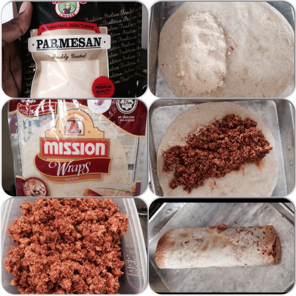 After the chicken sauce was cooked, I put some of it in the wraps together with some cheese and popped it in the oven for some time. Below are the steps.