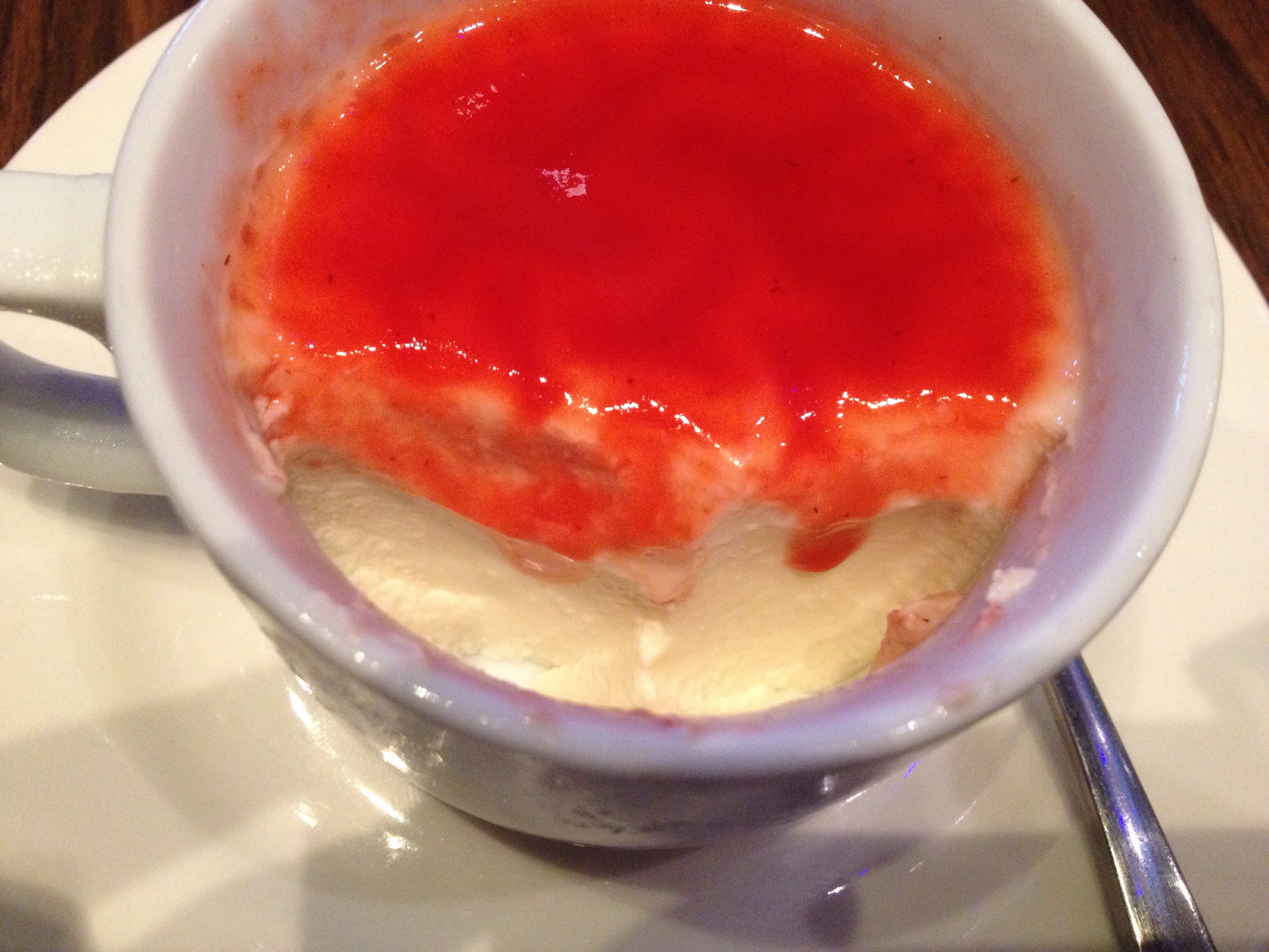 For dessert, I had the pannacotta. When it came, I was underwhelmed. I was expecting something interesting. It had a tart raspberry sauce on the top and a cream pudding, which I liked. It tasted okay, not very interesting. Nice presentation though.