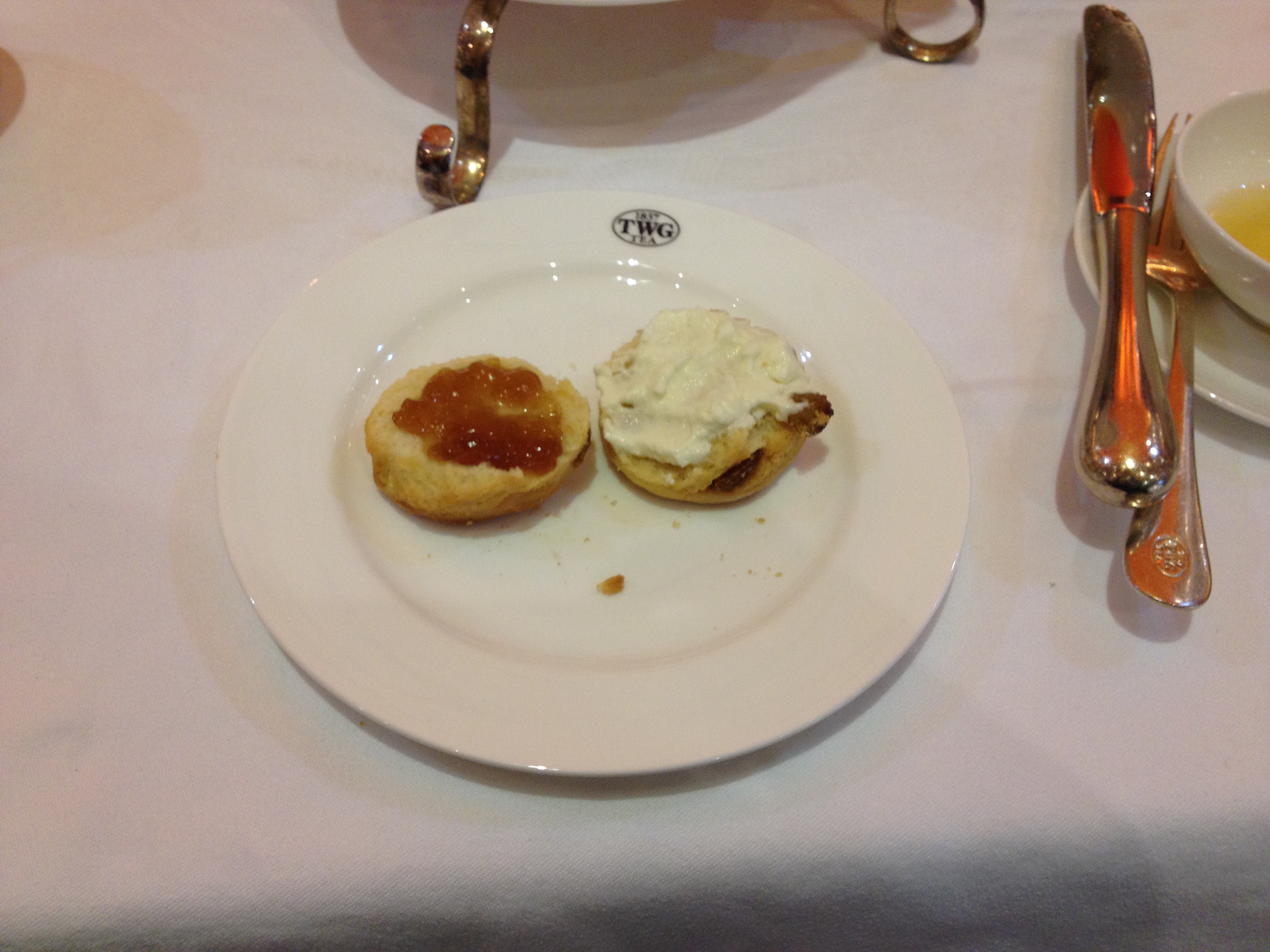 Left: Half a scone with TWG jelly. Right: Scone with clotted cream