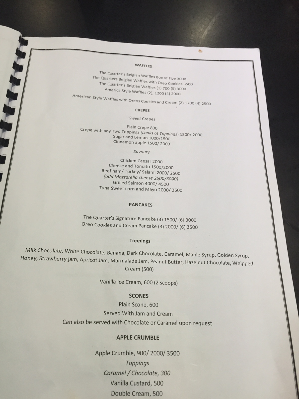 Unfortunately, looking at the menu, we almost left. We went to The Quarter Cafe for waffles and scones but they were so expensive! Waffles cost N3000!! And a scone cost N600. Their pancakes/waffles/scones must be out of this world because we found the prices ridiculous.