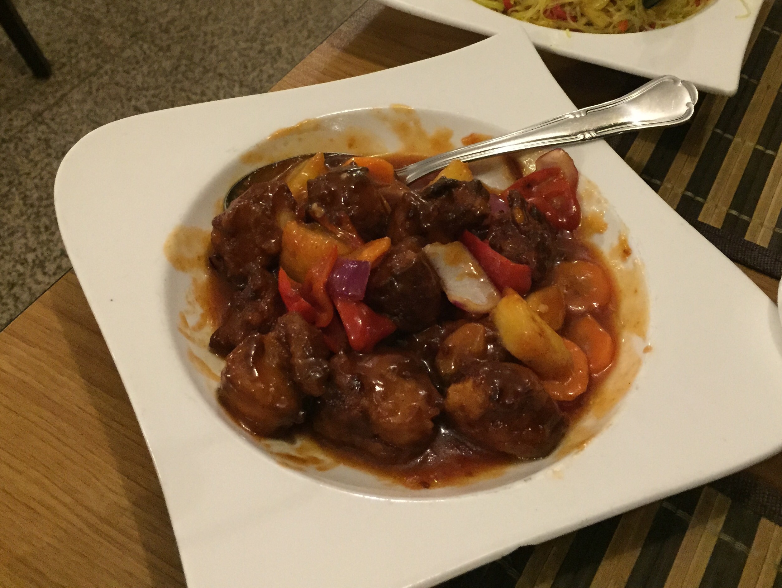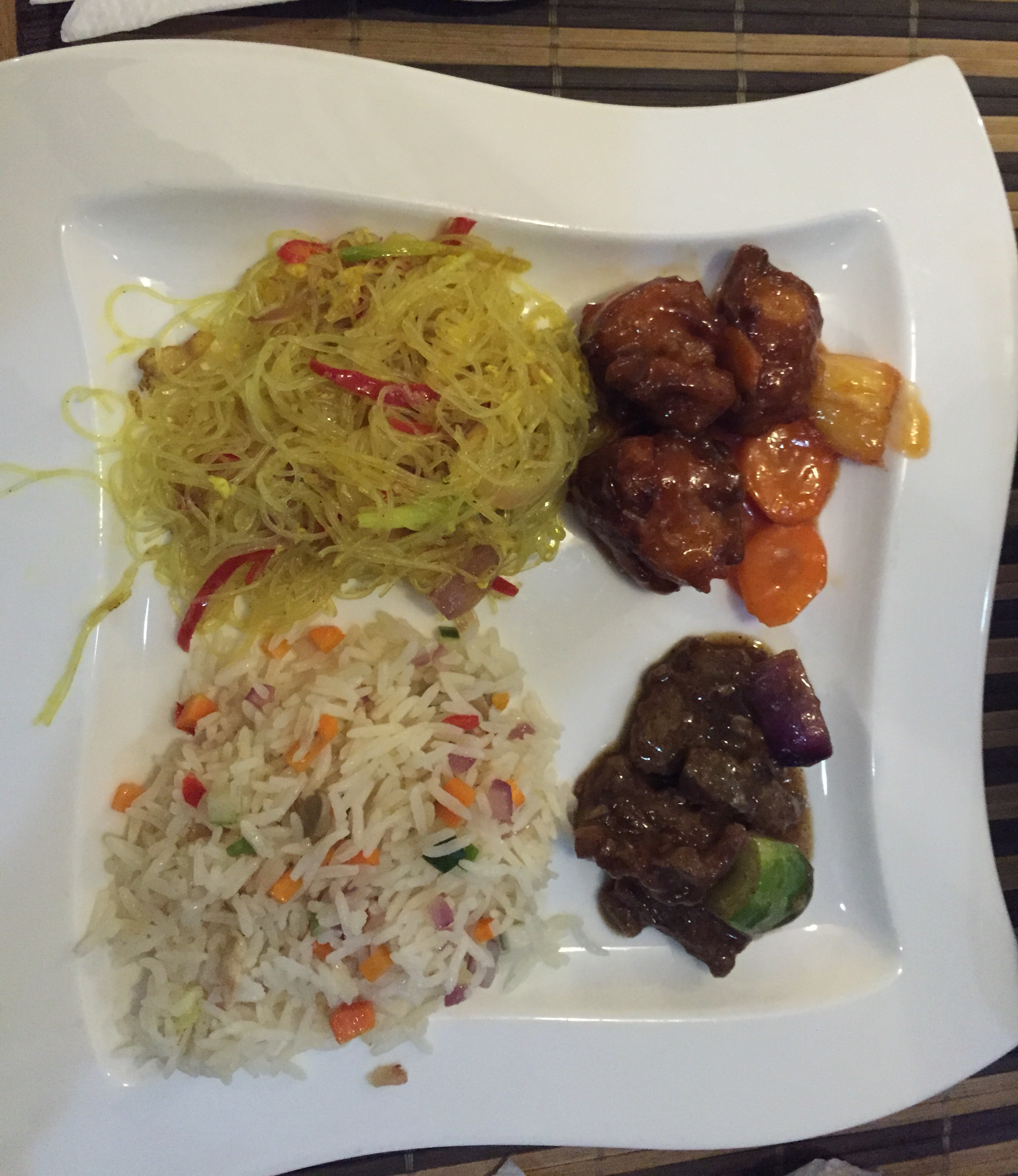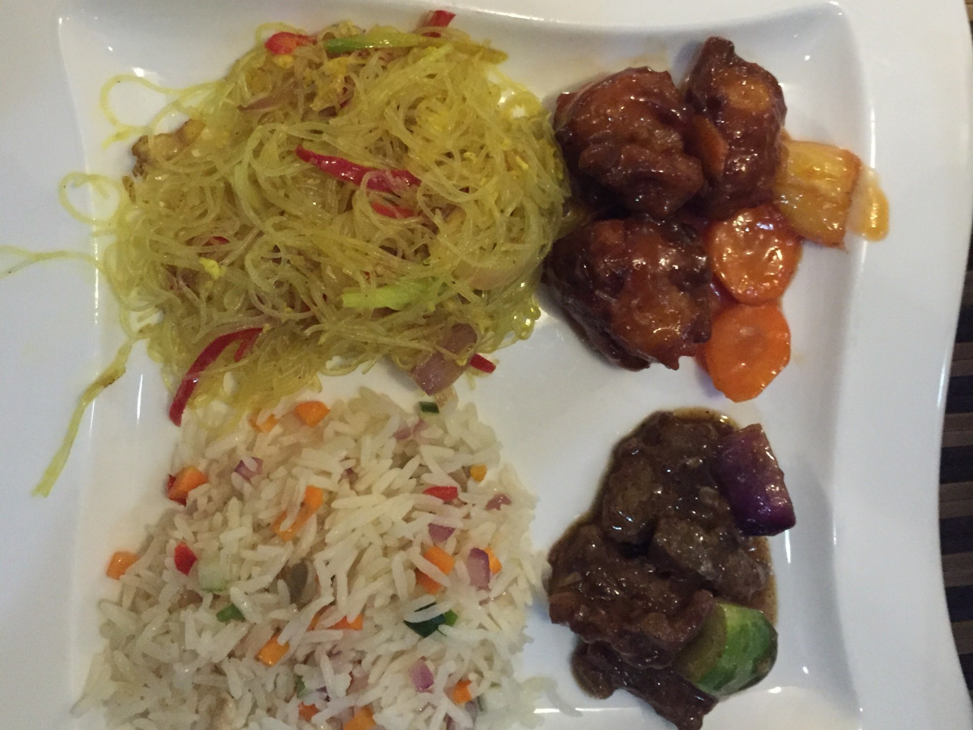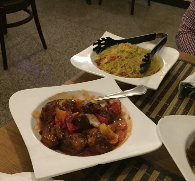 We ordered Chinese food: black pepper beef, sweet and sour fish, vegetable fried rice and Singapore noodles. Everything was good.