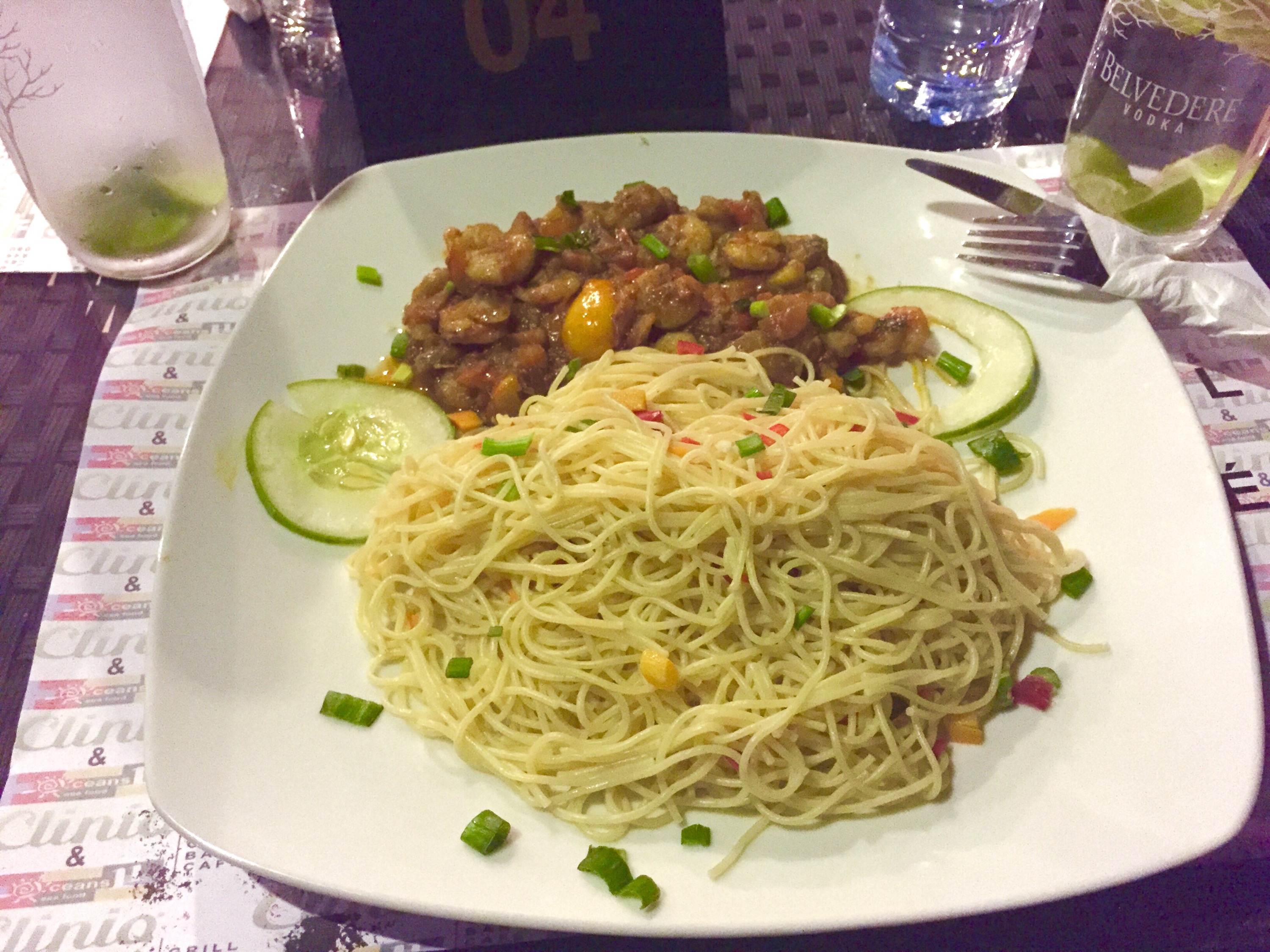 I got the grilled shrimp with pasta. In place of the pasta, you can get fries or rice. I usually have fries when I’m given options but I hadn’t had pasta in a while so I thought I’d order it instead. Doyin got grilled catfish with pasta. It took about thirty minutes for our orders to get to us.