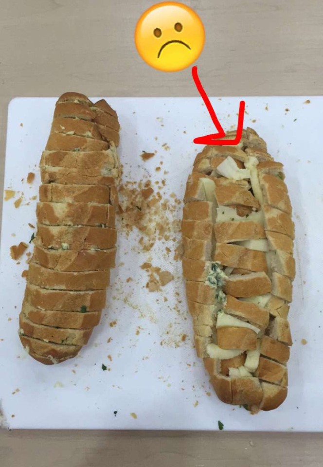 We started off with making the Virgin Mojitos and they were pretty easy to whip up. The next thing on the cooking agenda was making the  garlic bread and the cheese bread. Things got a bit tricky here. The bread we used were baguettes and I squished the cheese bread trying to cut it cross-ways. 😦  On seeing the squished bread, Chef Stone went “You ruined it.” and I felt bad. I came to realise that it wasn’t said to belittle me, Chef Stone says it a lot. The garlic bread turned out really good and I was impressed with myself. The cheese bread, on the other hand, needed a more tastier cheese. We used mozzarella which I think should have been tasty enough but it just felt plastic and was tasteless.