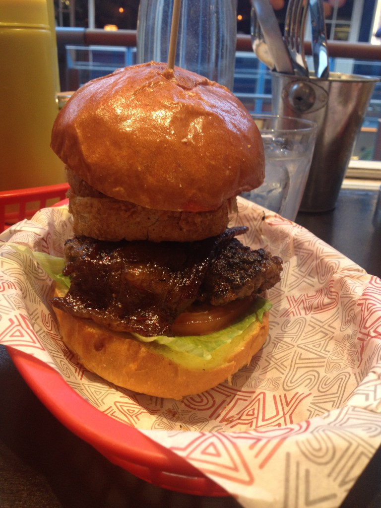 I ordered ‘The Big Stax’ which had maple glazed beef bacon, caramelized onions, tomatoes and lettuce with onion rings on the side. T got the popcorn shrimp and ‘The Stax Insanity’.