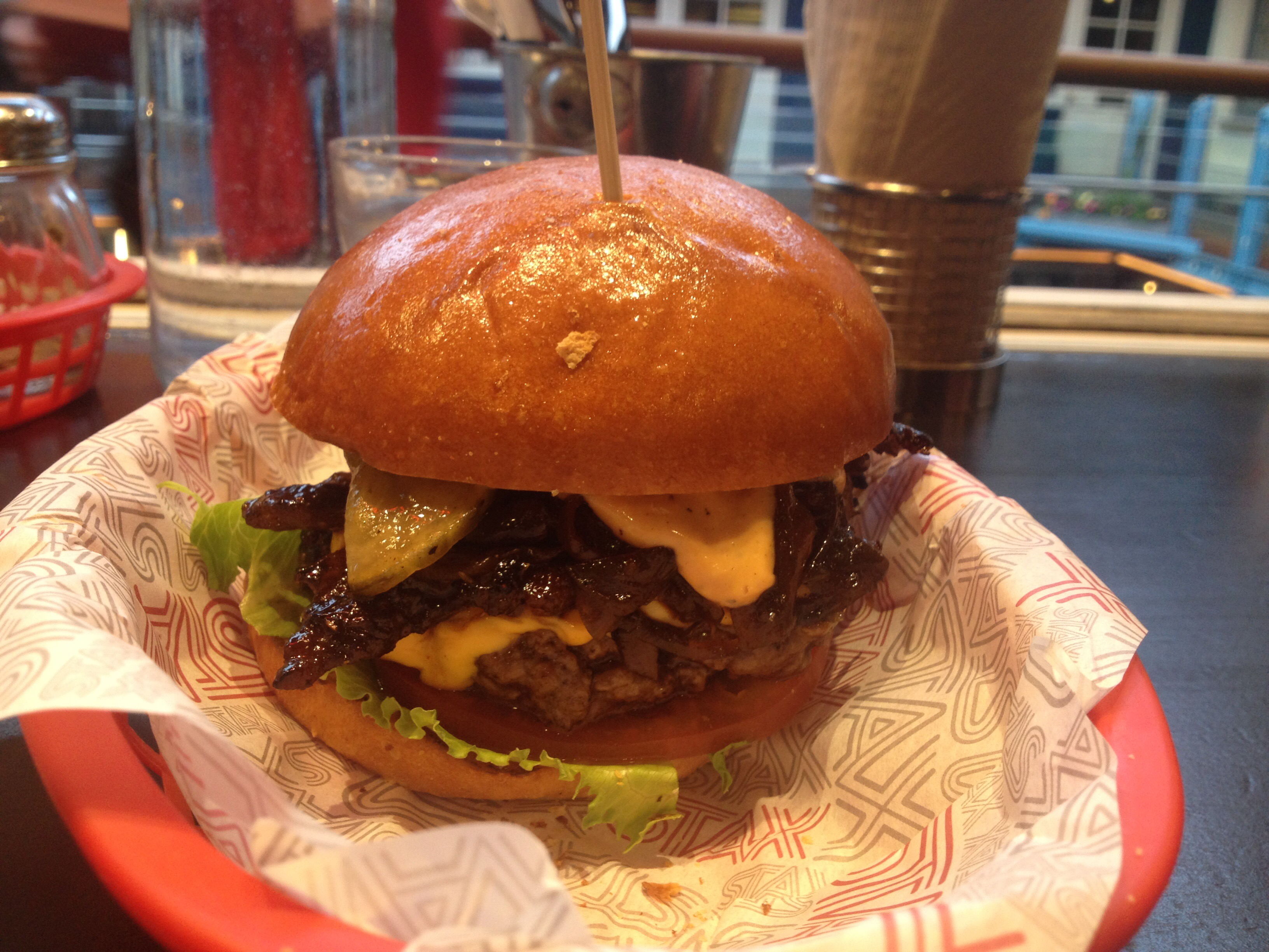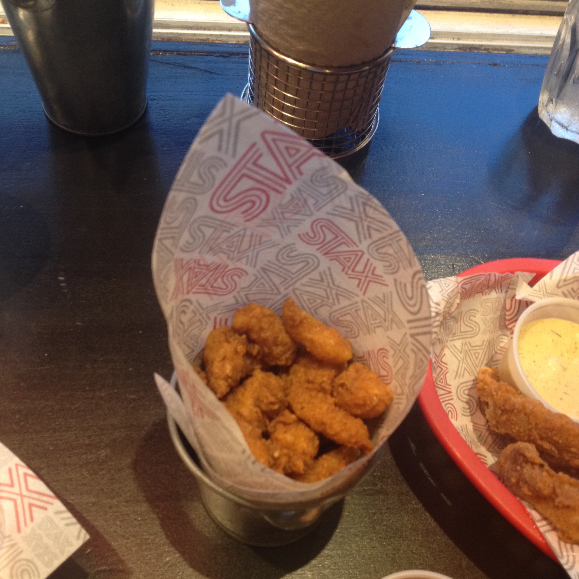 I ordered ‘The Big Stax’ which had maple glazed beef bacon, caramelized onions, tomatoes and lettuce with onion rings on the side. T got the popcorn shrimp and ‘The Stax Insanity’.