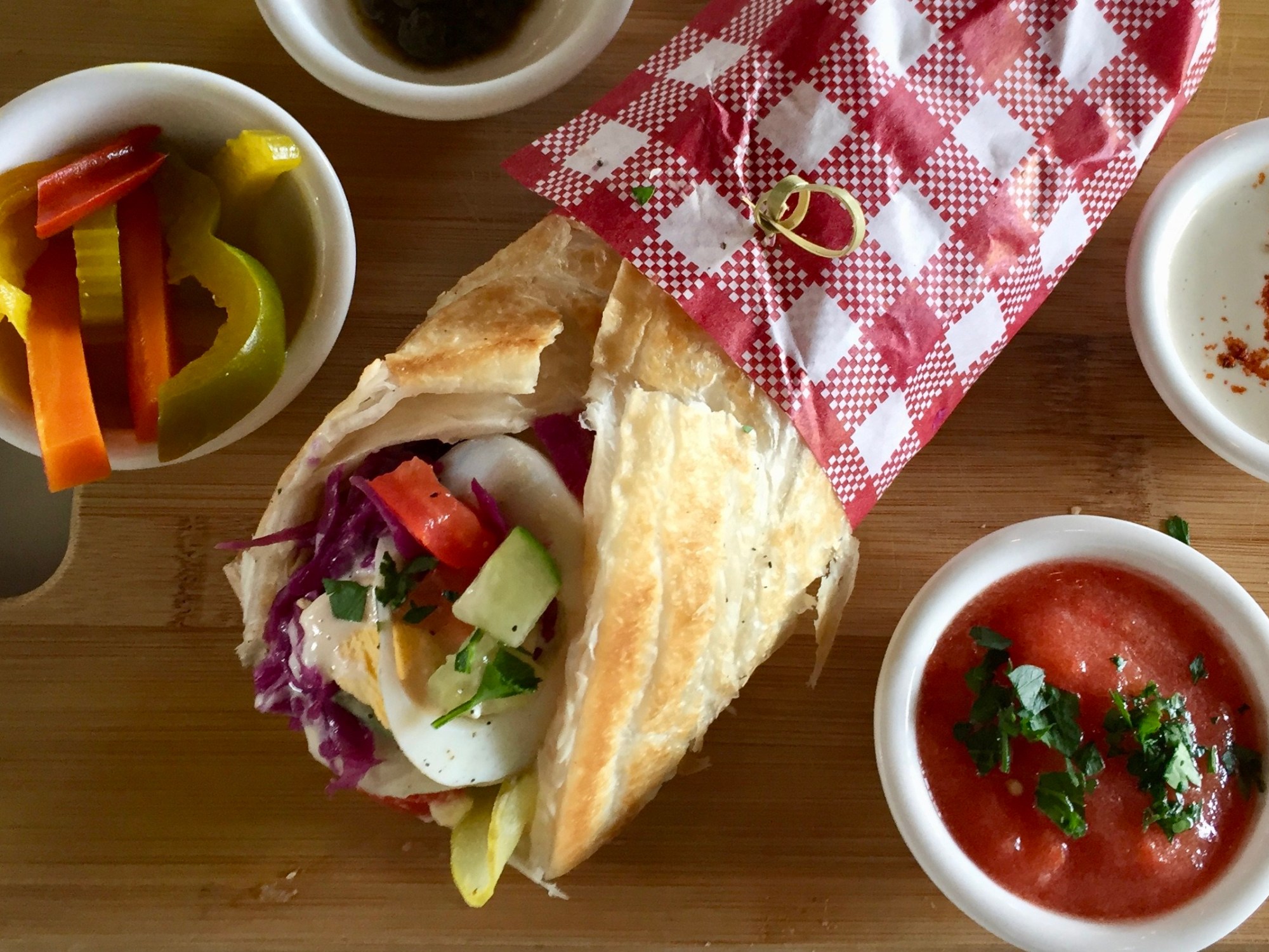 We ordered a double Walafel, which came with hummus, pickles, Israeli salad, cabbage salad and tahini sauce, as well as the Malawach pastry, which is a Yemenite flaky pastry and came with hummus, pickles, Israeli salad, cabbage salad, hard boiled egg with a side of tahini and crushed tomato. We also got free regular falafels to try, which was nice of them.