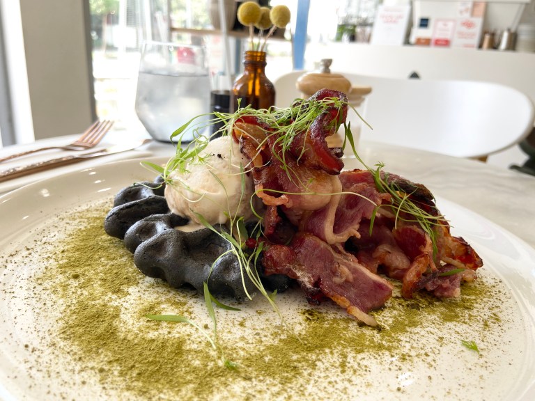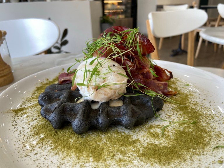 So, with my appointment done, I for on a train to Pascoe Vale. After walking up a steep hill and taking a break before I reached the top, I got to Anthropology. They have a new menu and I ordered a waffle again. However, this waffle was different was a charcoal (?) waffle and came with ice-cream and bacon (beef). I had considered a savoury dish but none spoke to me. Besides, this dish was a mix of sweet and savoury.